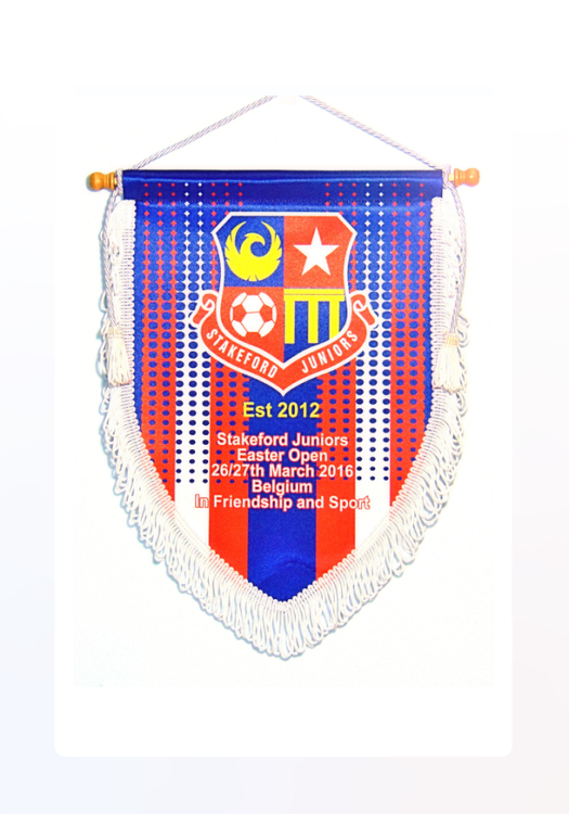When you are designing your pennant, make sure it’s easy to understand and looks balanced. Include your club badge, the name of the organisation, the event and the date, but do not fill it with too much. A typical personalised pennant will have the club or school badge, the team or competition name, the year or season and a sponsors logo (if you need one).